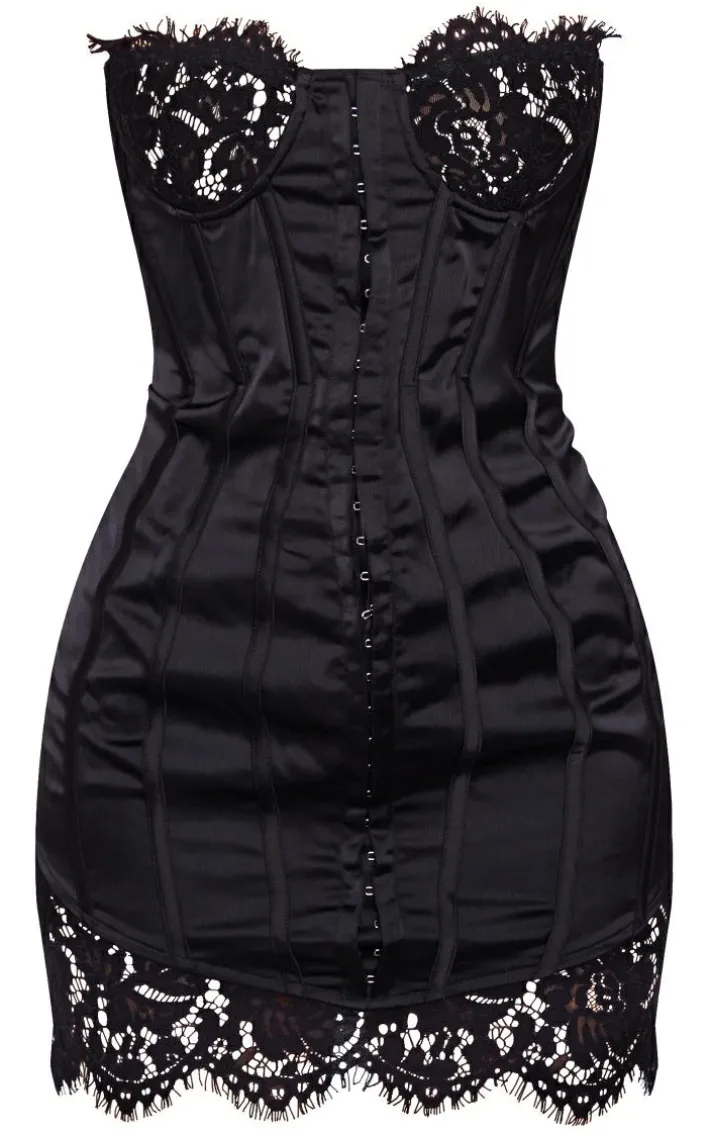 Get hearts racing in this black lace trin satin hook and eye detail bandeau bodycon dress. This unreal dress is made from a black satin material with a lace trim, you will be feeling fiercely feminine in this bodycon dress. With its hook and eye detail and bandeau fit, what more could you want ? Team this dreamy dress with your fave heels and a pair of silver hoops for a look like no other.
