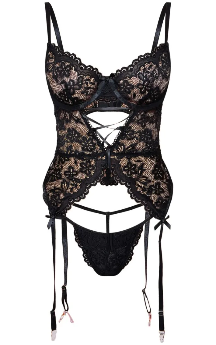 Nothing makes you feel more confident than some elegant lingerie, which is why you need this black lace up floral lace corset lingerie set. Brought to you in a black floral lace fabric with a lace up corset design and matching lace thong, you’re guaranteed to fall in love. Just add a satin robe and slippers to feel your best.