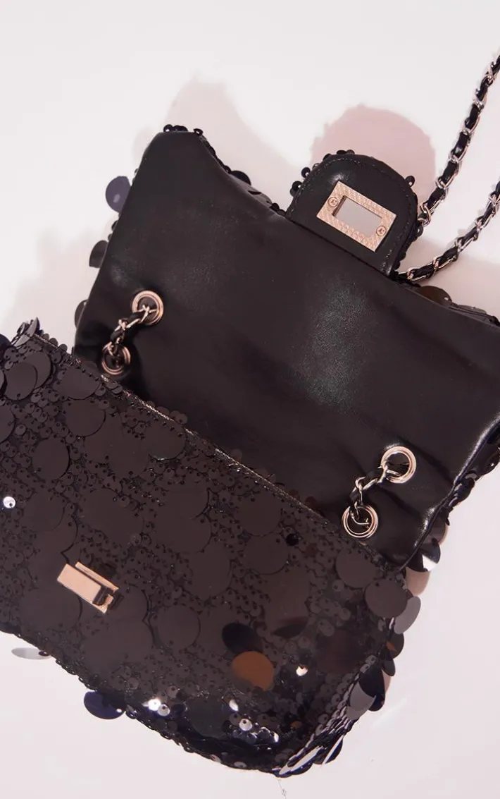 Instantly elevate you weekend look with this black large sequin flap over cross body shoulder bag. Brought to you in a black hue material with a flap over design, a cross body style and large sequin detailing for that statement touch of glam, how can you resist? Just add this shoulder bag to your outfit for the perfect finish.