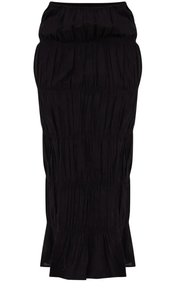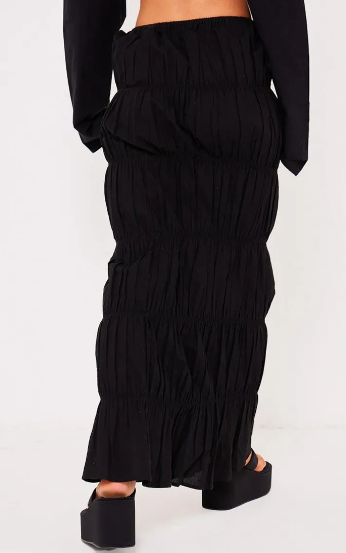 You are guaranteed to look effortlessly chic in this black linen look ruched maxi skirt. Brought to you in a black hue linen look material with a ruched design and a flattering maxi fit, how can you resist? Pair this max skirt with the matching top, flatform sandals and gold accessories for a look that will earn you some serious style points all season long.