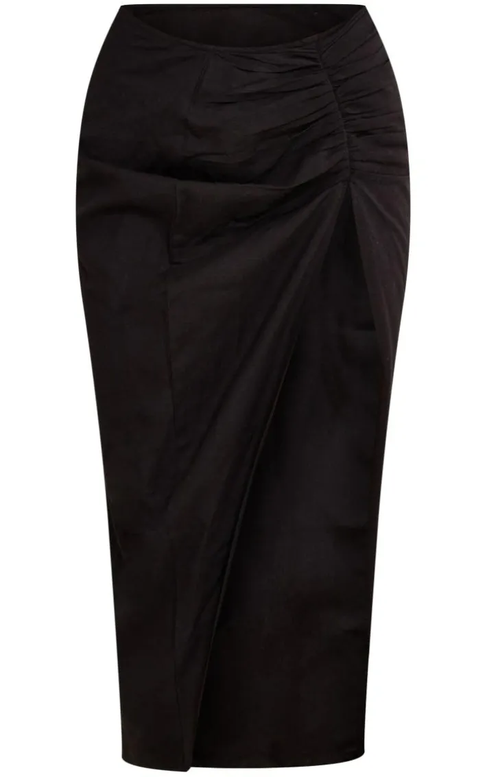 Swap your usual skirt for this black linen look ruched split detail maxi skirt. This skirt is brought to you in a black linen look material for an effortlessly chic look we are obsessing over. With a ruched split detail, what more could you want ? Team this dreamy maxi skirt with a cute tee and some clear heels to take the look to new heights.