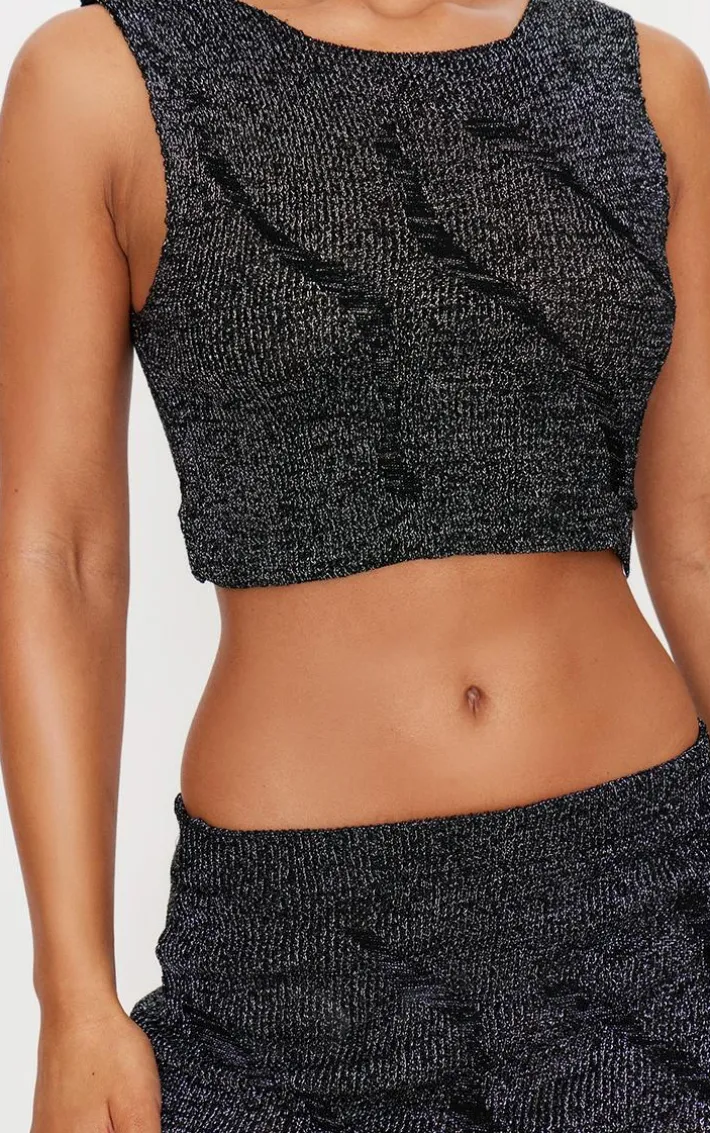 Add some more knitted tops to your new season collection with this black lurex knitted contrast detail crop top. We’re obsessed with its fierce contrast detail design, black lurex knitted fabric and crop top fit. Why not pair with the matching knitted skirt and heels to earn all the compliments?