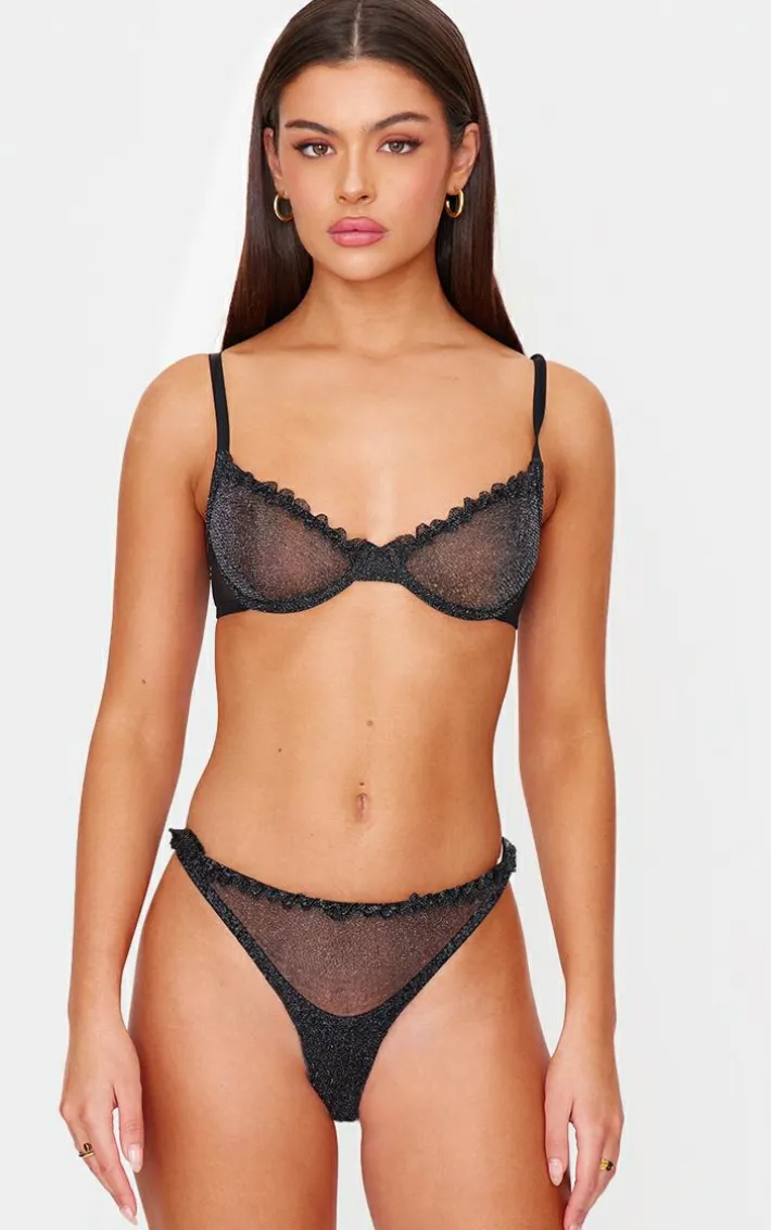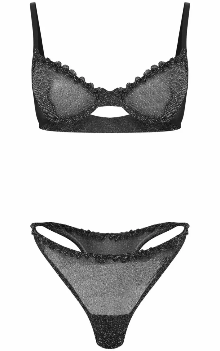 Look all kinds of luxe in this black lurex mesh lingerie set. This set includes a bra and matching thong, both in a black lurex material, what more could you want? Style this lingerie set with a satin robe and simple accessories for a look that is sure to get hearts racing.