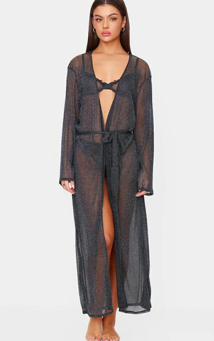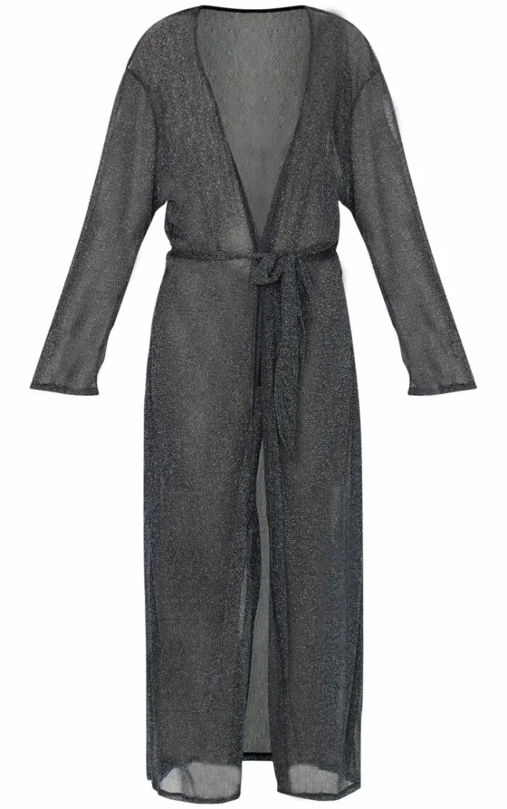 Look all kinds of chic in this black lurex mesh maxi robe, perfect for those late nights in. Made from a black hue lurex mesh material with a tie fastening, this maxi robe is all the new you need. How can you resist? Style over a lingerie set with simple accessories to get hearts racing.