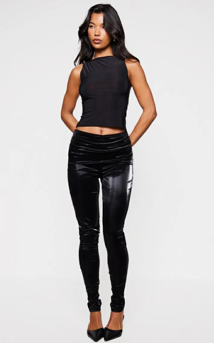 Set trends with these black matte vinyl low rise fold over waist pants. Brought to you in a black matte vinyl material with a low rise fit and a fold over waist. Pair these pants with a pair of heels, a basic tee and your go-to gold accessories for a look everyone will be loving.