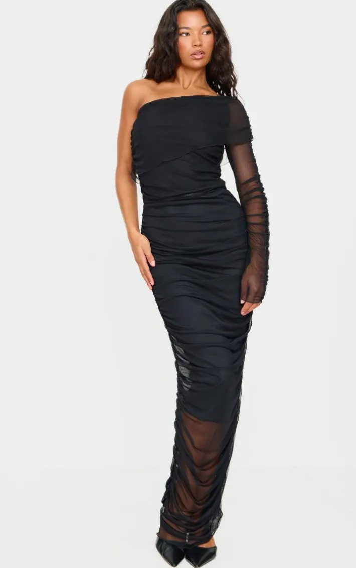 For your next big occasion outfit, look no further than this black mesh bardot one sleeve maxi dress. Made with a classic black hue mesh fabric, a bardot neckline and one sleeve design, we are obsessed. Own the moment by pairing this maxi dress with heels and a clutch bag.