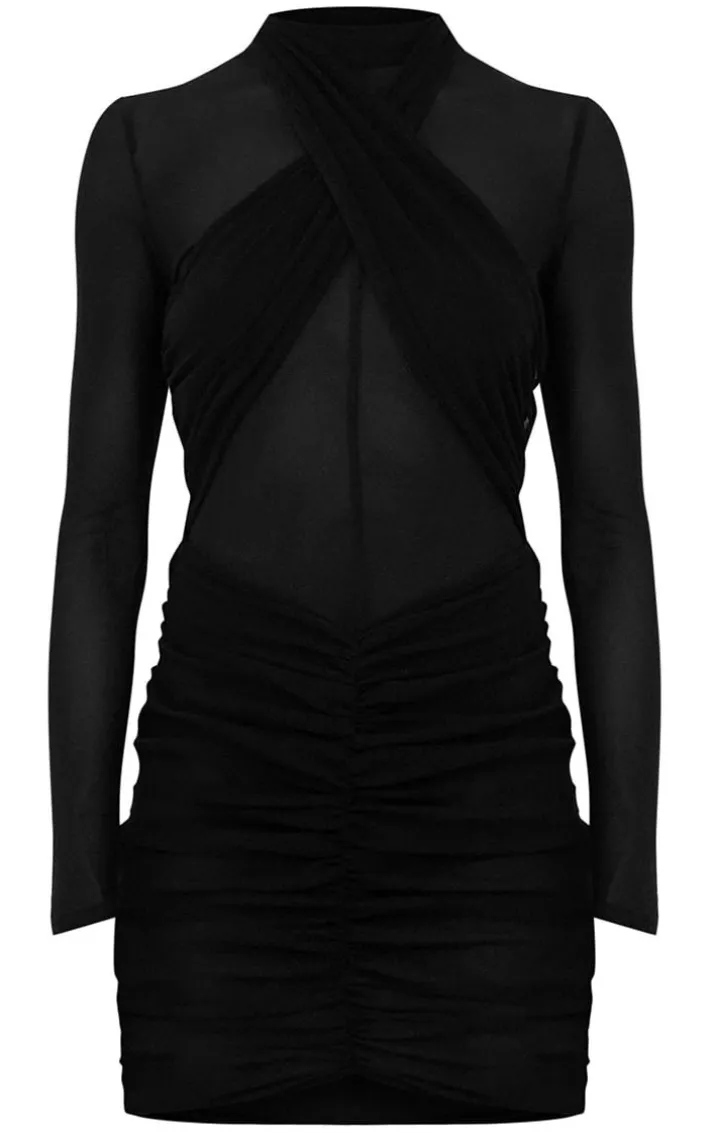 Everyone needs a little black dress in their wardrobe and this black mesh bodysuit cross front ruched bodycon dress is sure to tick all the boxes. It features a black mesh material with a cross front design and ruched detailing, you won’t be able to resist this bodycon dress. Pair it with your highest heels and simple accessories for a look everyone will remember.