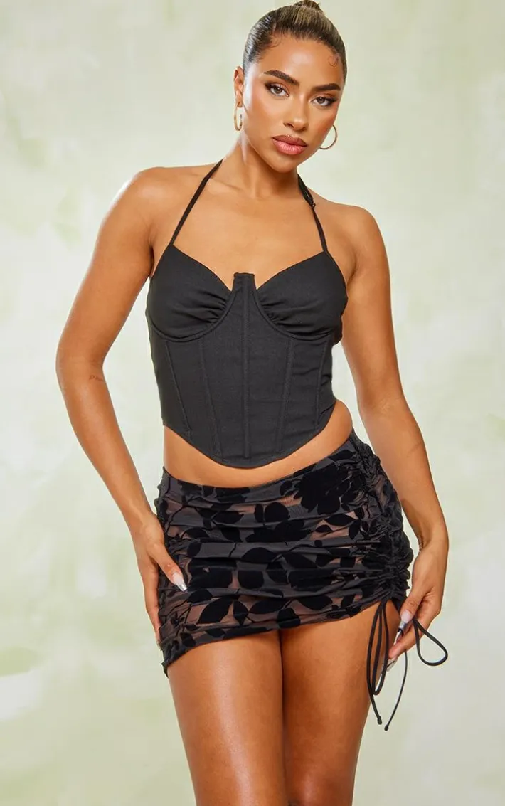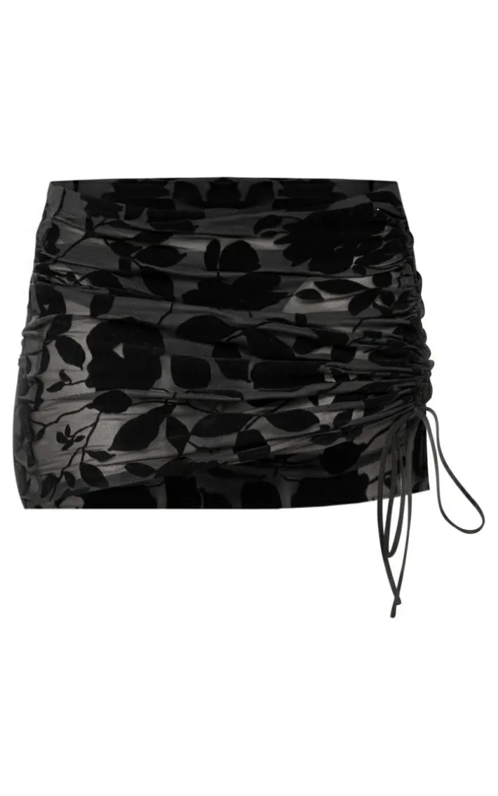 Look all kinds of chic in this black mesh devore ruched side mini skirt. Brought to you in a black hue mesh devore material with a ruched side design and a mini fit, how can you resist? This mini skirt is sure to bring all the glam vibes to your weekend plans. Style with a flattering corset top, clear strap heels and statement accessories for a weekend-worthy look that will steal the stares