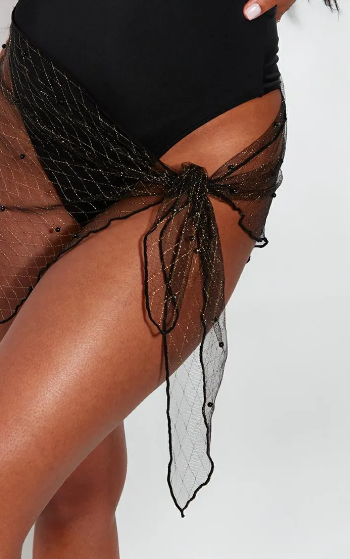 Amp up your swimwear style with this black mesh pearl detail lurex beach sarong. Brought to you in a black mesh material with a pearl detail, what’s not to love? This lurex beach sarong is all you need to stand out from the rest. Style this sarong with a matching hue bikini set and slides for an unreal pool-side look.