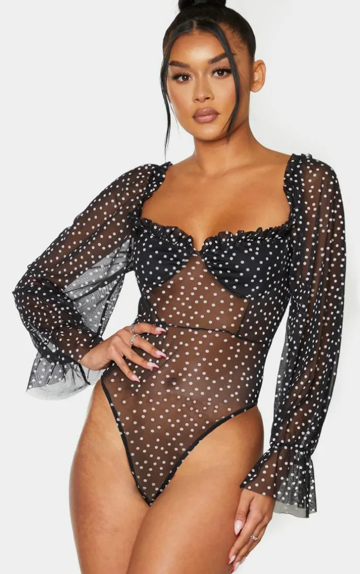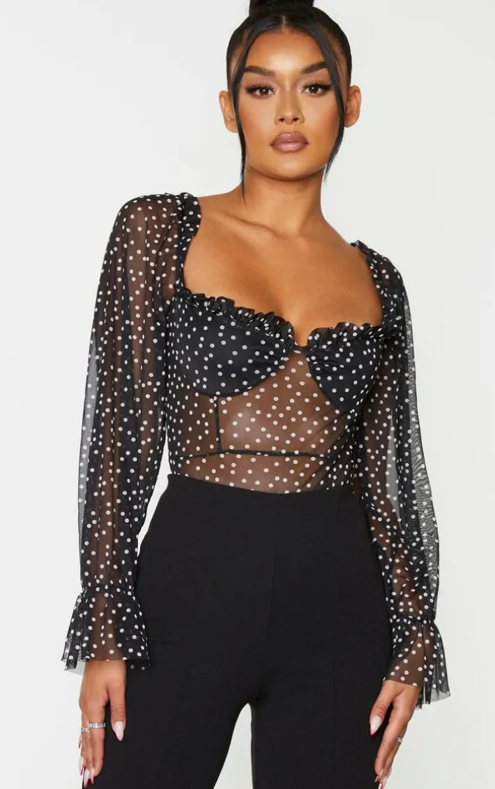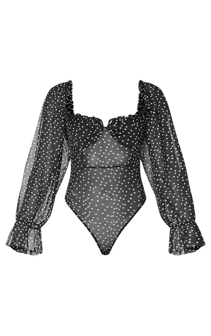 This milkmaid design bodysuit is sure to give any look a chic finish. Featuring a black polka dot mesh material with a milkmaid design bust and sheer sleeves, style it with a black tailored two-piece and strappy heels to finish the look.