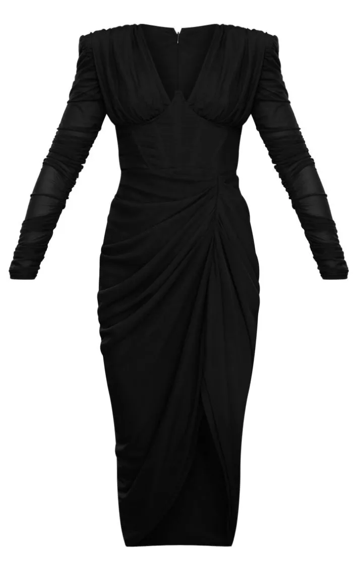 This black mesh ruched long sleeve draped midi dress is perfect for taking your weekend wardrobe to a whole new level. With a black mesh material with long sleeves, ruched detailing and a draped design, you’re going to have all the attention on you this season. Whether you’re getting date night ready or need the perfect weekend fit, this women’s midi dress is sure to be at the top of your hit list. Pair this dress with clear heels and your fave hoop earrings for the ultimate glam finish.