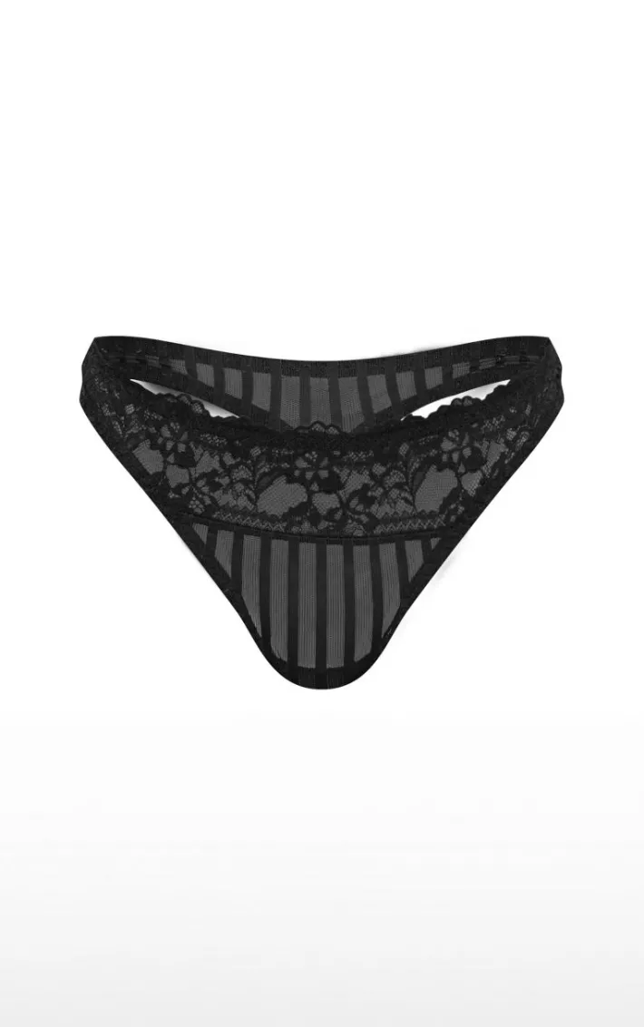 This black mesh stripe thong is sure to make you look and feel your most confident self. With its must have black shade, mesh material and stripe design, this thong is sure to elevate your lingerie collection. Team with the matching bra for and your fave accessories for a chic finish. Why not throw on a satin robe? It’s a yes from us.