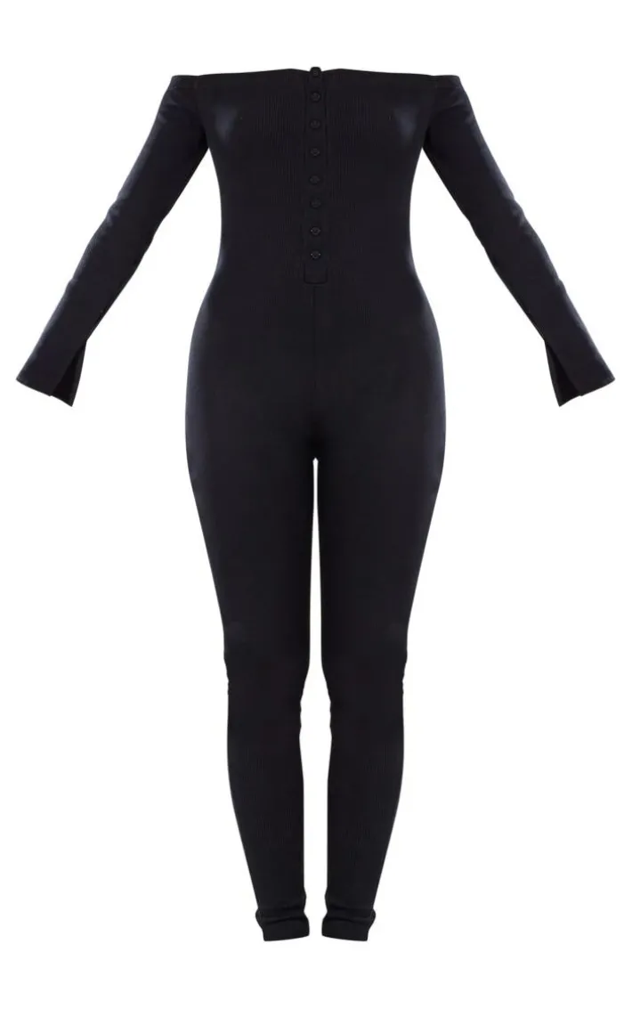 Your off duty days are calling out for this black off the shoulder button front ribbed jumpsuit. Brought to you in a black ribbed material with an off the shoulder design, we are obsessed. This jumpsuit has a button front fastening, perfect for those on the go days and beyond. Team with your fave sneakers and accessories for a look we are loving.