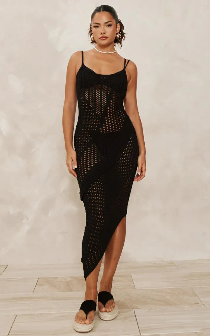 Say hello to the must-have dress of the summer with this black open knit frill detail maxi dress. Its black open knit material adds an instant luxe of touch to your look and its frill detail gives you those feminine feels. This maxi dress is seriously dreamy and perfect for any summer plans or vacays you have coming up. Team with chunky sandals and gold accessories for a look that is sure to impress.