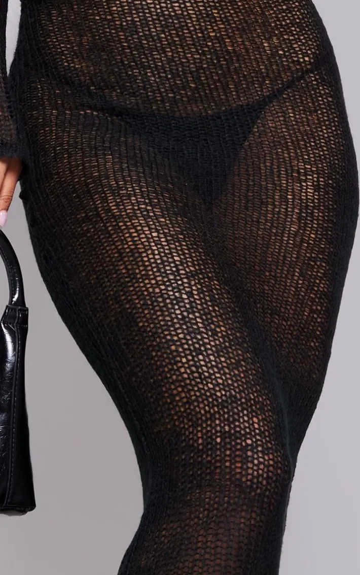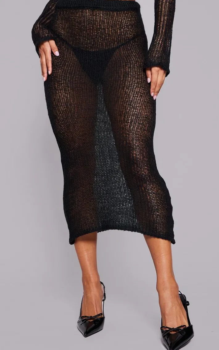 Dress to impress this weekend with this black open-knit midi skirt. Made from an open-knit material with a simple design and a figure-flattering fit, how could you say no? Get ready to steal all the stares with this midi skirt and be the topic of everyone’s conversations. Team with the matching top, clear heels, and a metallic shoulder bag for a flawless finish.