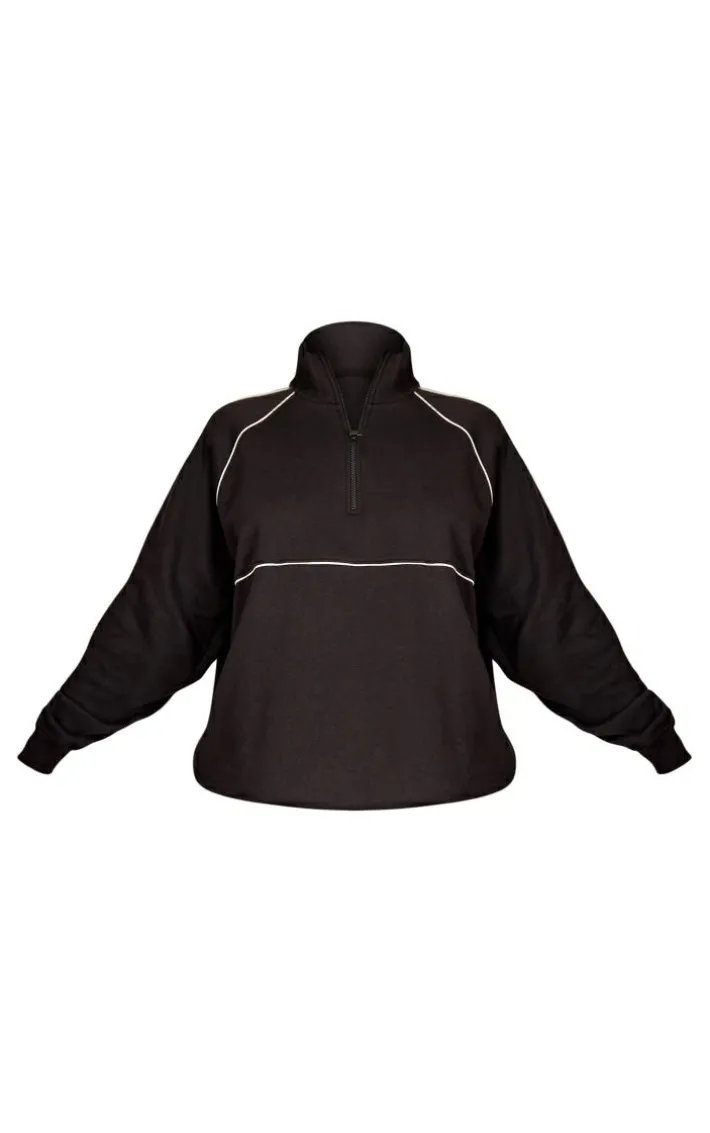 Take on those chilled days in style with this black oversized contrast piping quarter zip Sweatshirt. Brought to you in a black hue material with contrast piping detail, a quarter zip design and an oversized fit, what more could you want? Team this black Sweatshirt with matching hue bottoms, sneakers and simple accessories for an effortless every day look like no other.