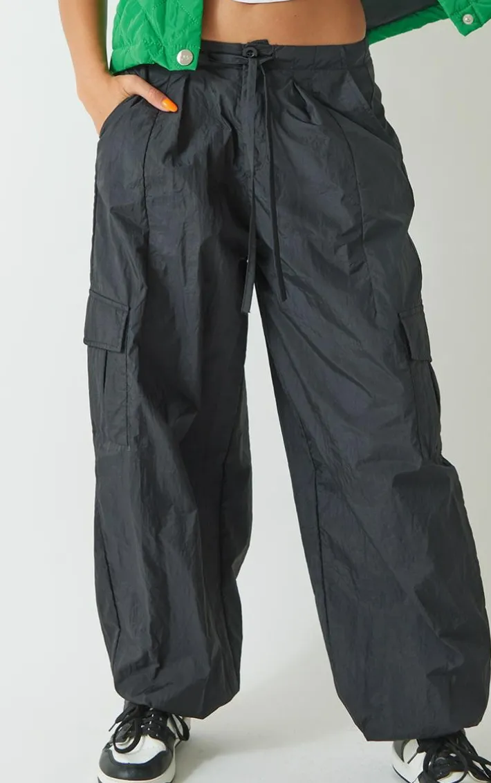 Nail this seasons must-have trends with these cargos. Featuring a black shell material in a parachute style and a tie waist, what more could you want?. Wear with a white corset, sporty visors and box-fresh kicks for an insta-worthy combo.