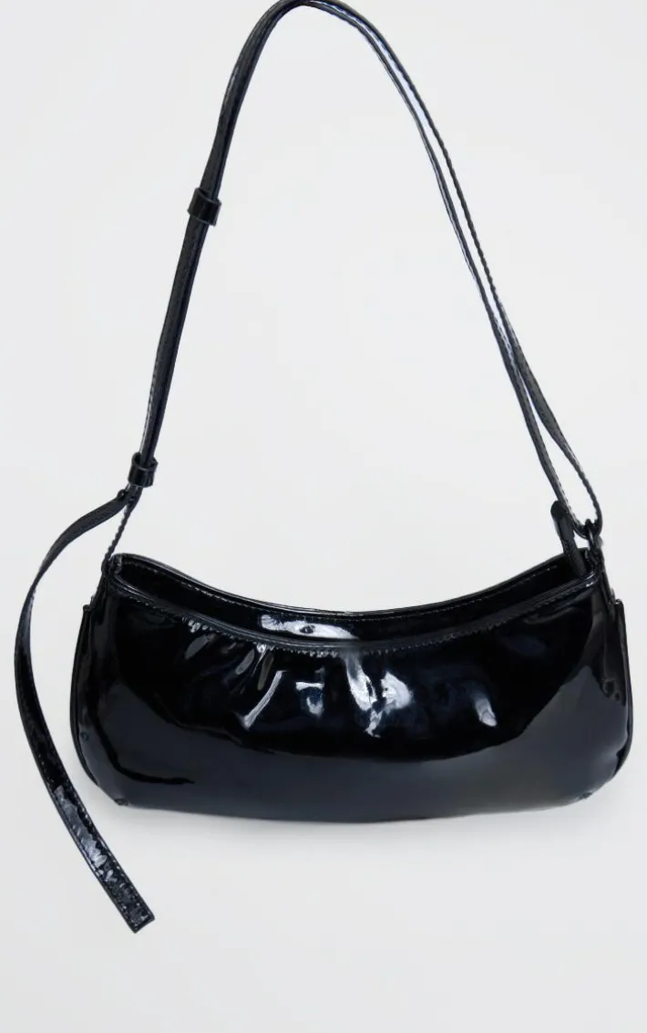 Add this black patent handle slim shoulder bag to your collection, you’ll be reaching for it again and again. Brought to you in a neutral black shade, with a luxe patent material and sleek slim design, treat yourself or a loved one to this bag. Style with a brushed grey coat for a fool proof finish.