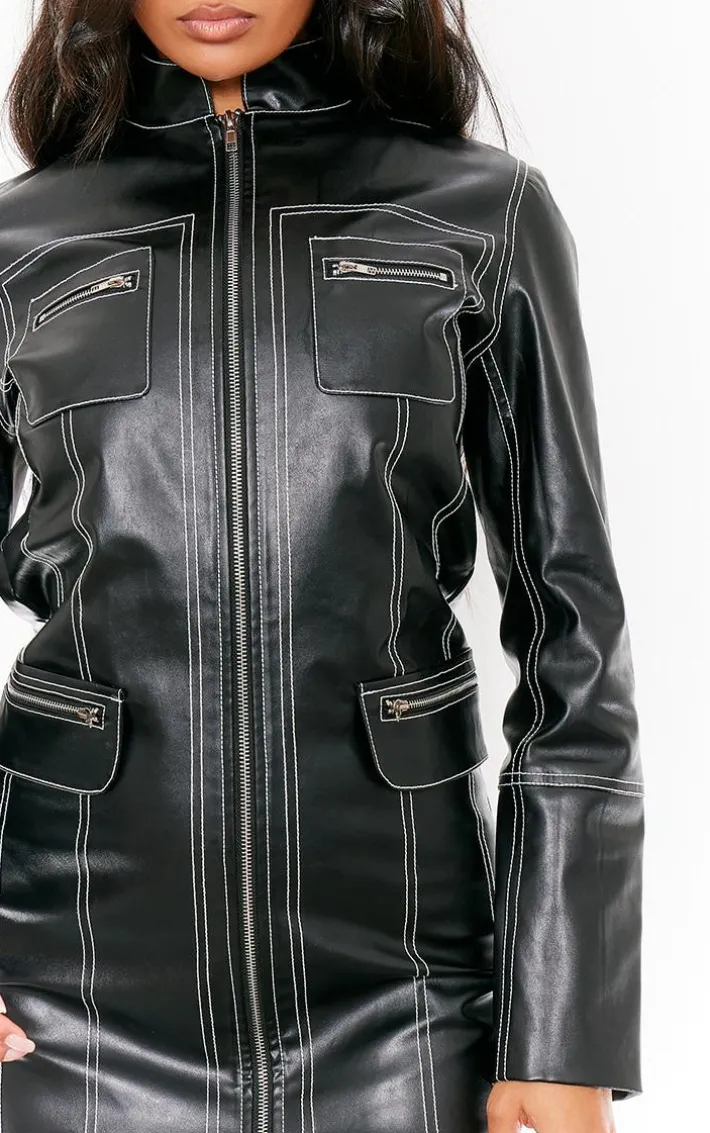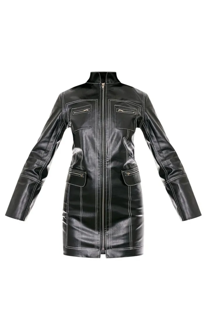 When the weekend calls for a little drama this black patent PU contrast stitch zip up bodycon dress will have you at the center of attention. It is made using ablack patent PU material with a contrasting stitch, a zip-up front and a figure-hugging fit, what more could you want ? Style this with clear slip-on heels and statement accessories to elevate the look further.