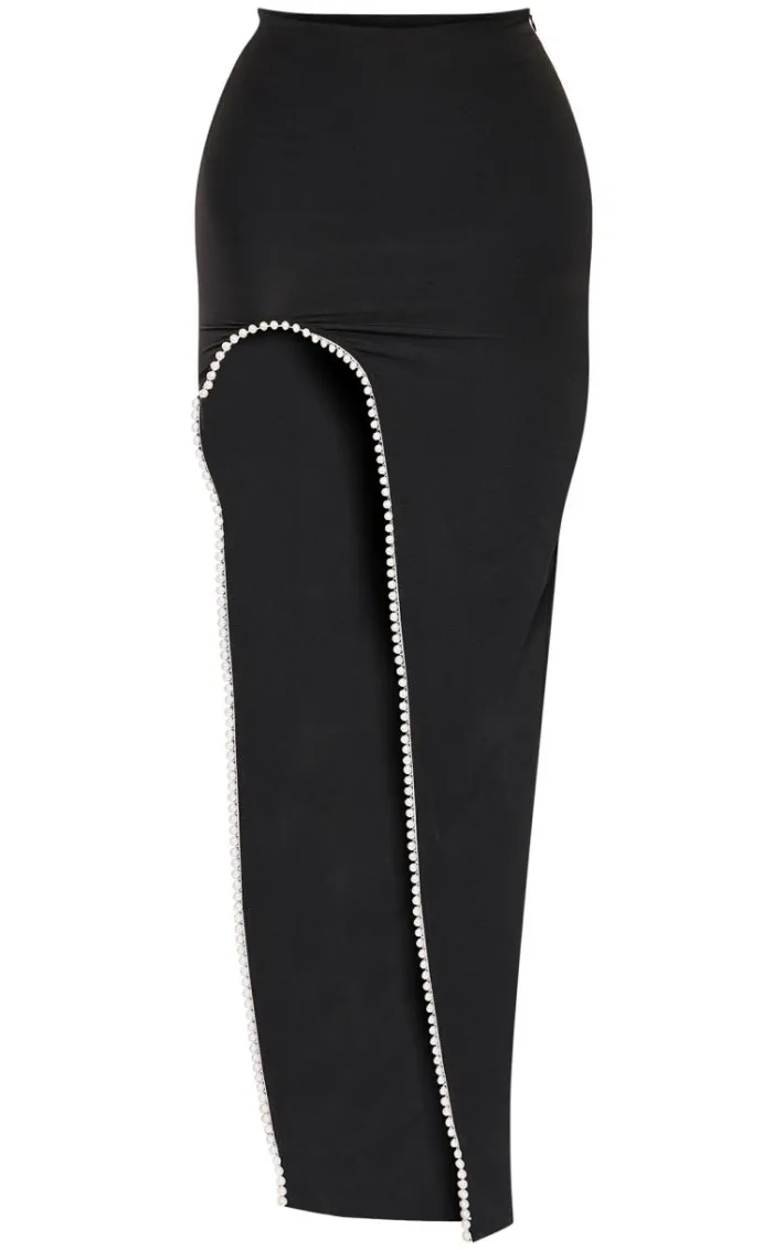 Add a little glam to your weekend wardrobe with this unreal black pearl thigh trim woven maxi skirt, it is perfect for your next upcoming occasion and beyond. With a black woven material, pearl detailing and a thigh split design, everyone will be asking about this maxi skirt. Style it with a bandeau top, slip-on heels and statement accessories to earn all the compliments.