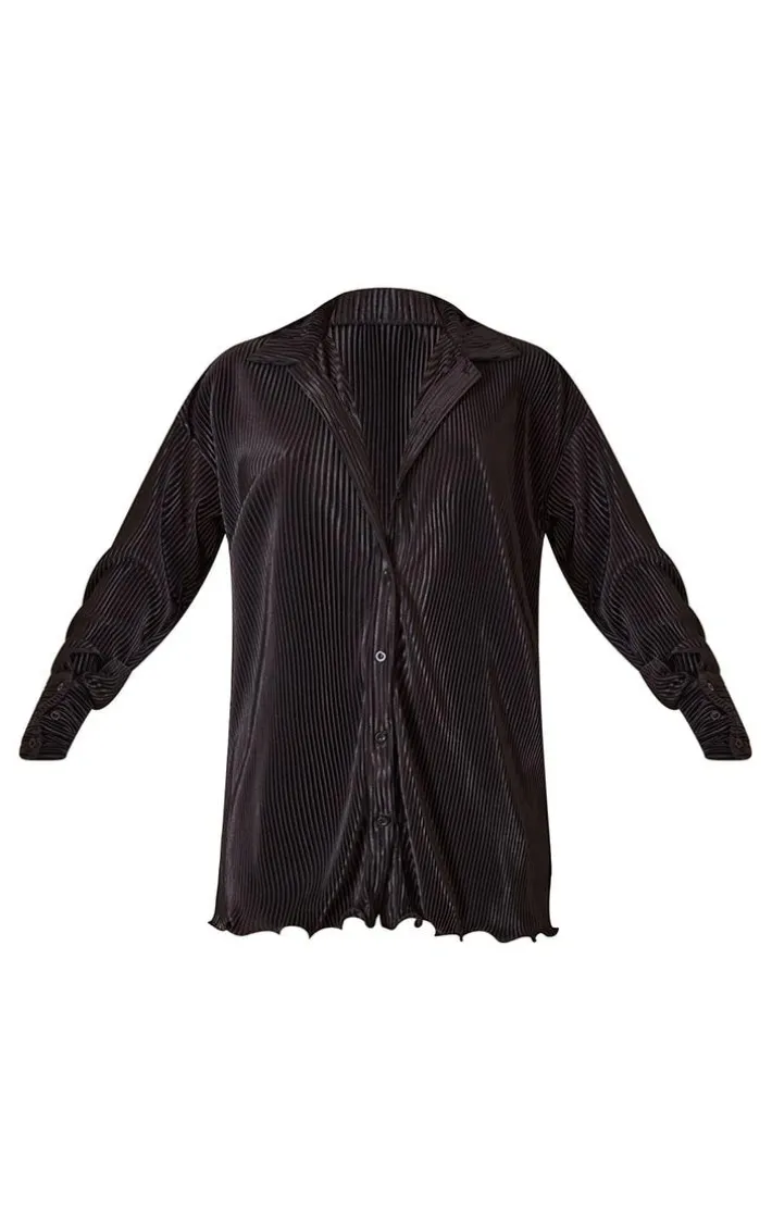 Get that effortlessly chic vibe on point with this must-have dress. Featuring a black plisse material with a frill hem and shirt design, what’s not to love? Take your look to the next level and team with statement heels and gold accessories.