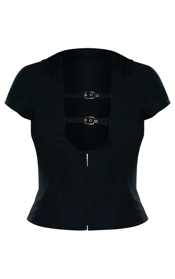 Add a little edge to your collection with this black plunge buckle detail corset shirt. Brought to you in a versatile black shade, with a plunge design and buckle detail, we are obsessed. The corset style will add a touch of luxe to your look. Pair with a black mini skirt and fresh white crew socks to finish the look.