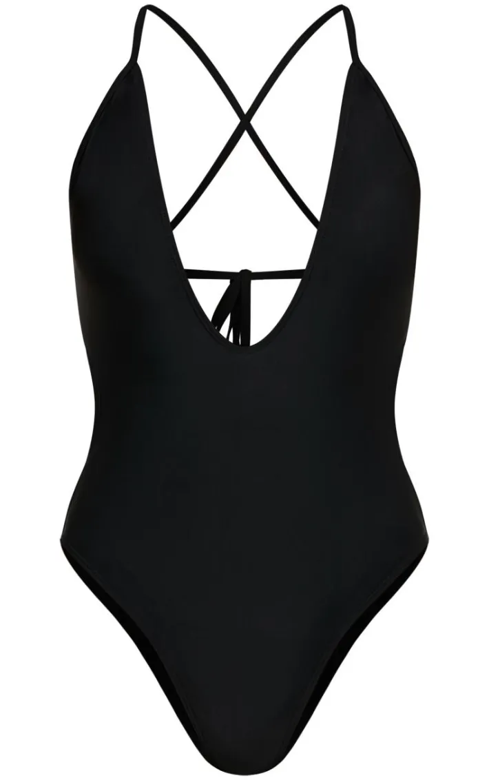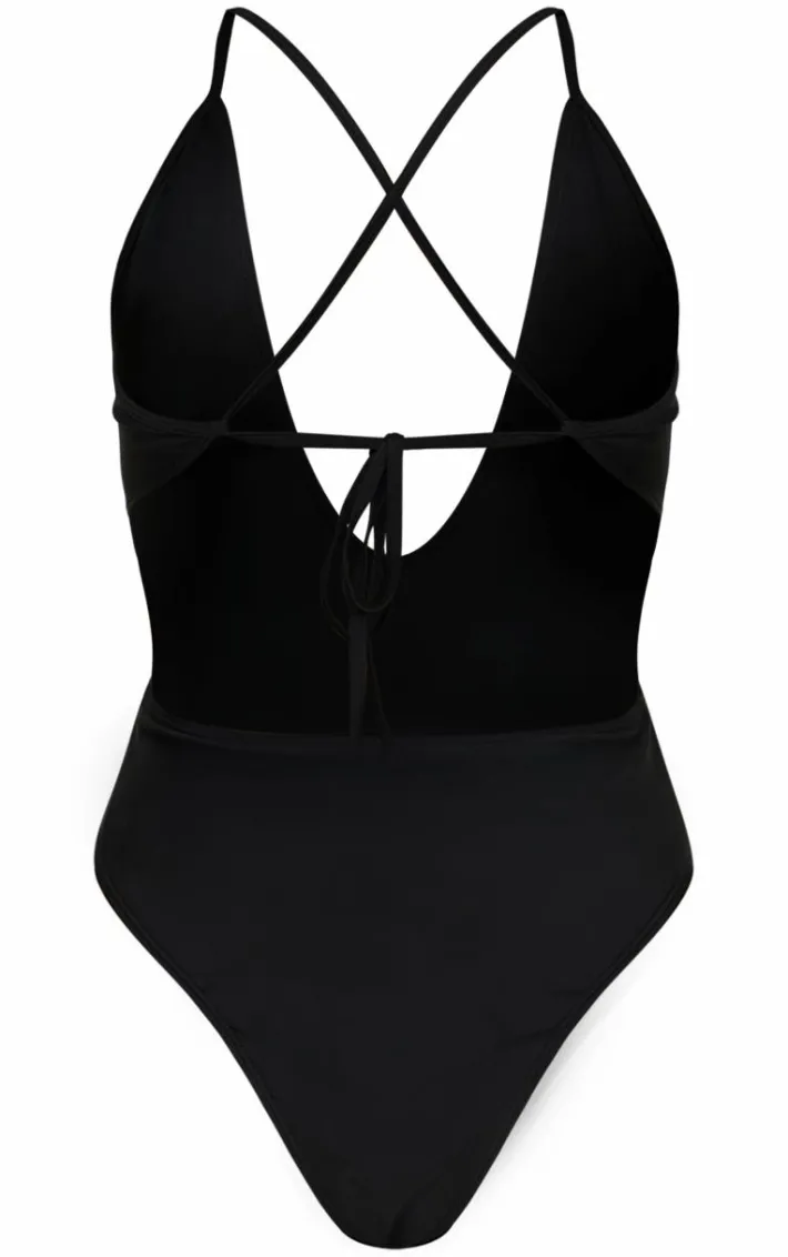 Show off your shape in this black plunge tie back swimsuit. Brought to you in a black hue material with a plunging neckline and tie back detailing, what more could you want? Style this black swimsuit with gold accessories for a look we just can’t get enough of.