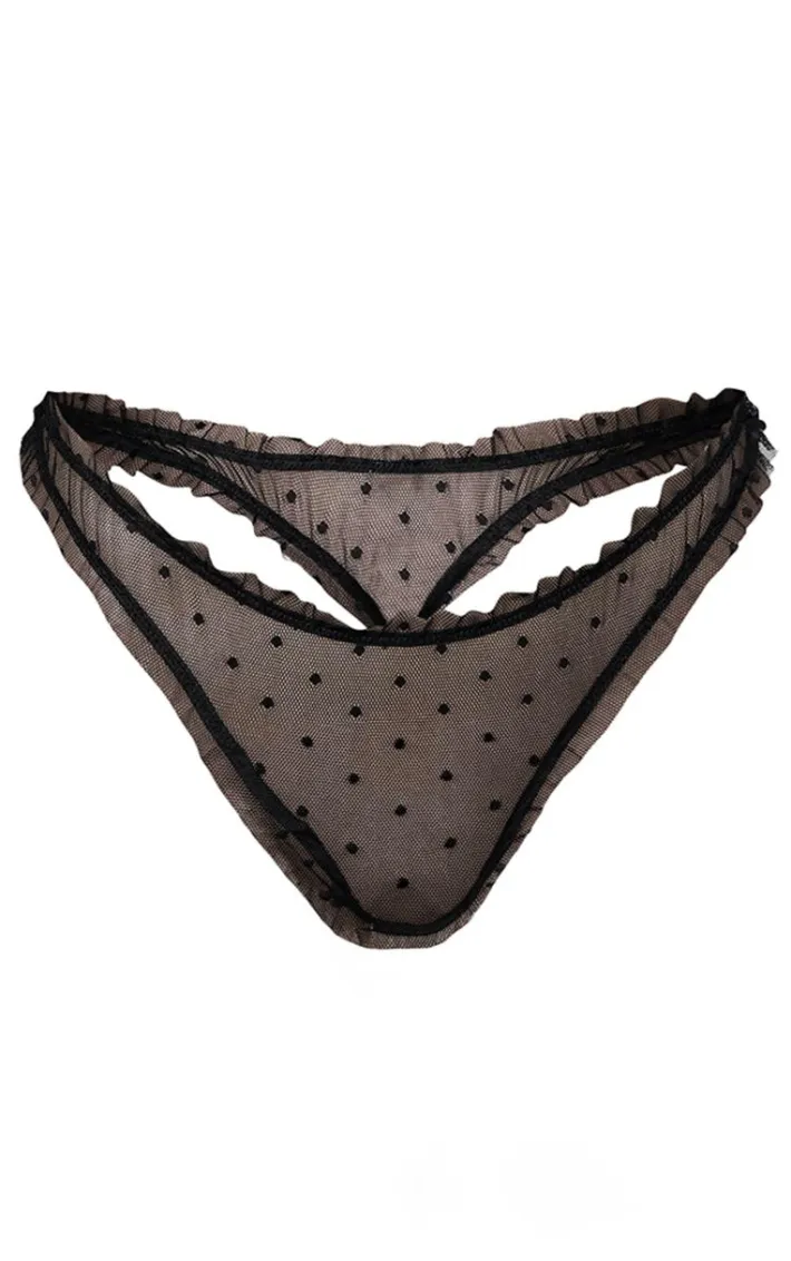 Whatever your weekend plans, this black polka dot mesh frill thong is a must have. Made from a black hue mesh material with a polka dot design and frill detail, this thong is at the top of our most wanted list. Style with the matching bralette, gold accessories and a robe for an elevated evening look. How can you resist?