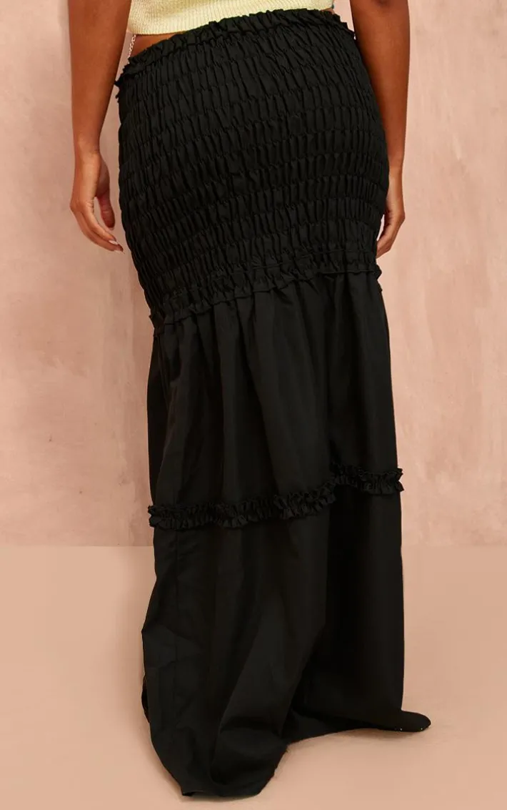 Make sure your new season look stays on point in this black poplin shirred dropped waist maxi skirt. Brought to you in a black poplin material with a shirred dropped waist design and a maxi fit, how can you resist? Style this maxi skirt with a crop top, sandals and simple gold accessories for an effortlessly chic look we’re loving.
