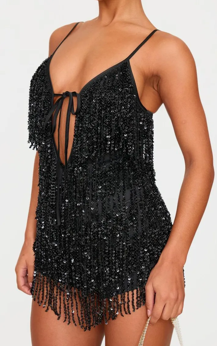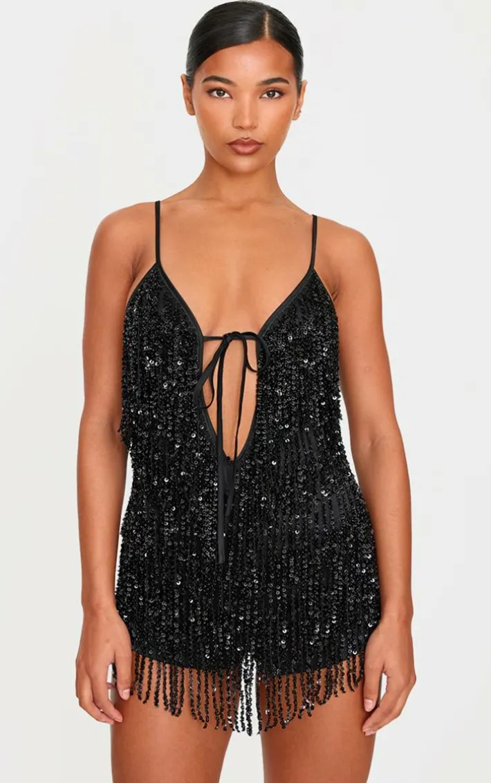 Say hello to your party season staple with this black premium full embellished plunge strappy romper. Brought to you in a black hue material with a full embellished design, plunge neckline and strappy detail, this romper is a must have. How can you resist? Team with slip on heels and gold accessories for a look like no other.