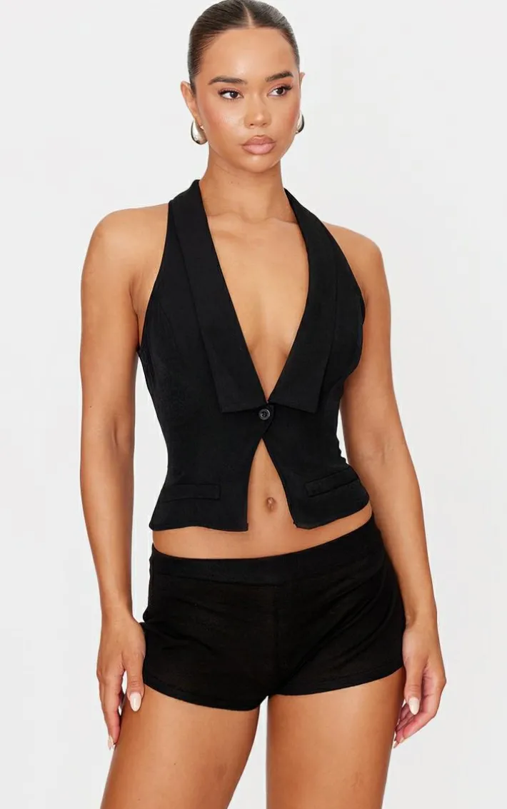This black premium woven collar detail plunge vest is all the new you need for the season ahead. Made from a black hue premium woven material with acollar detail and plunge neckline, this vest is at the top of our list. Style with black hot Pants, slip on heels and gold accessories for a chic finish. It’s a yes from us.