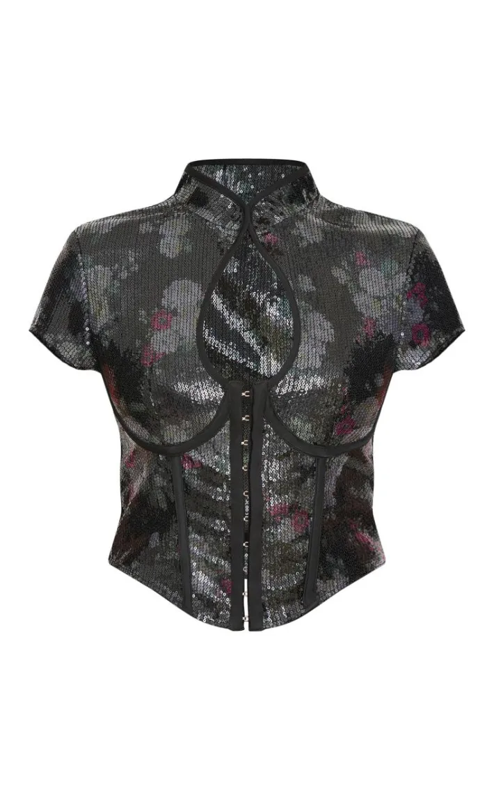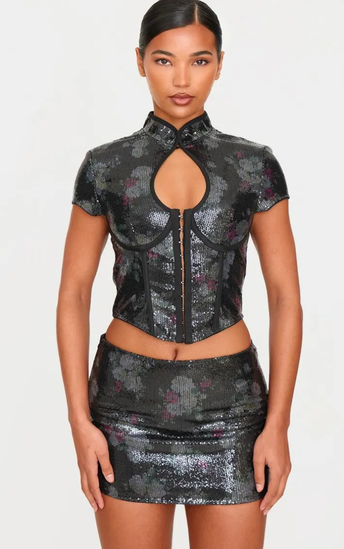 Make styling easy this events season with this black printed sequin band collar corset top. Brought to you in a black hue material with a printed sequin design and band collar detail, this corset top is a must have. Team with the matching mini skirt, statement heels and gold accessories for a look like no other.