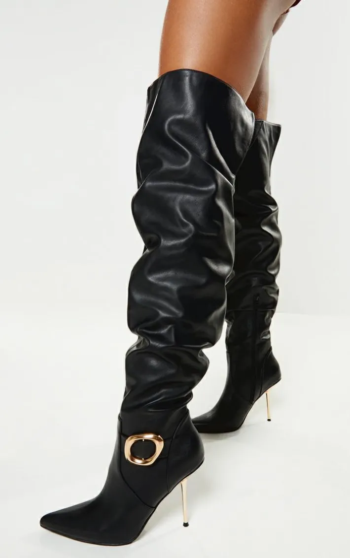 Make a statement in these black PU gold buckle point toe high stiletto over the knee boots. Brought to you in a black material with a point toe design, bold buckle detailing and an over the knee style, we are obsessed. Simply add these high stiletto boots to your weekend outfit to instantly elevate the look.