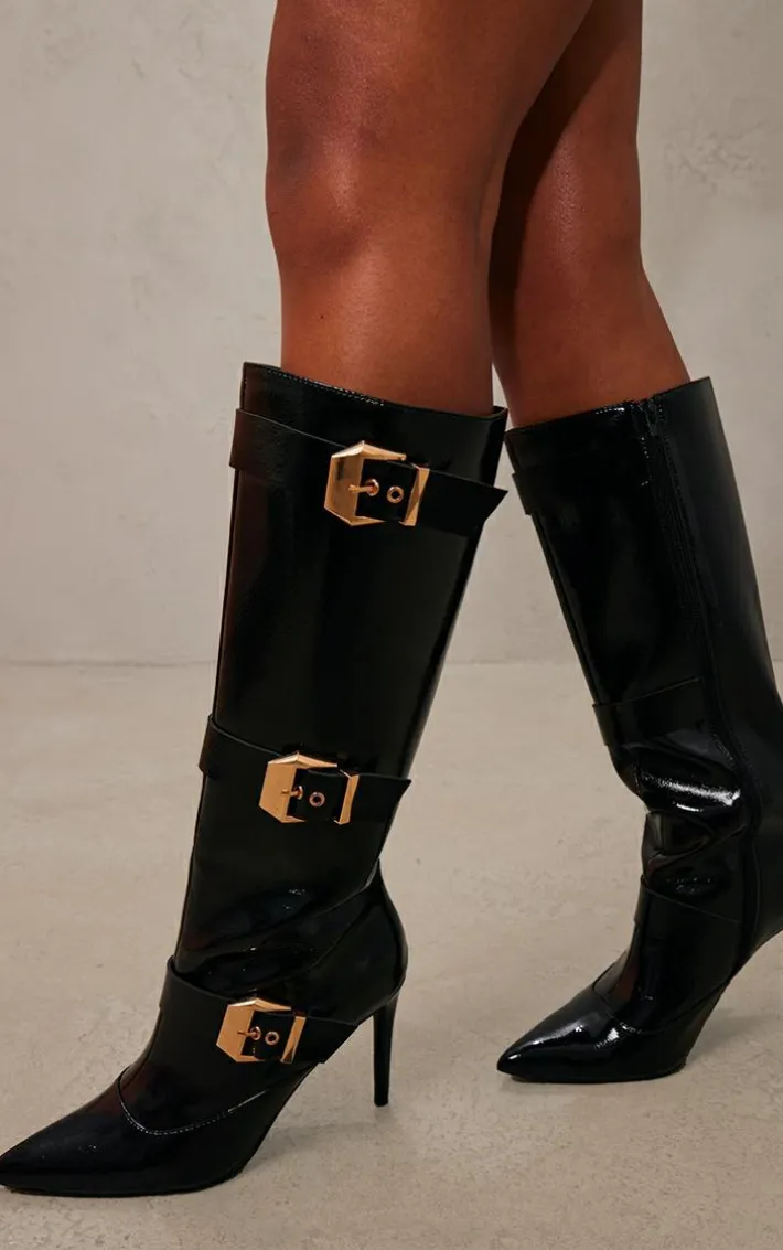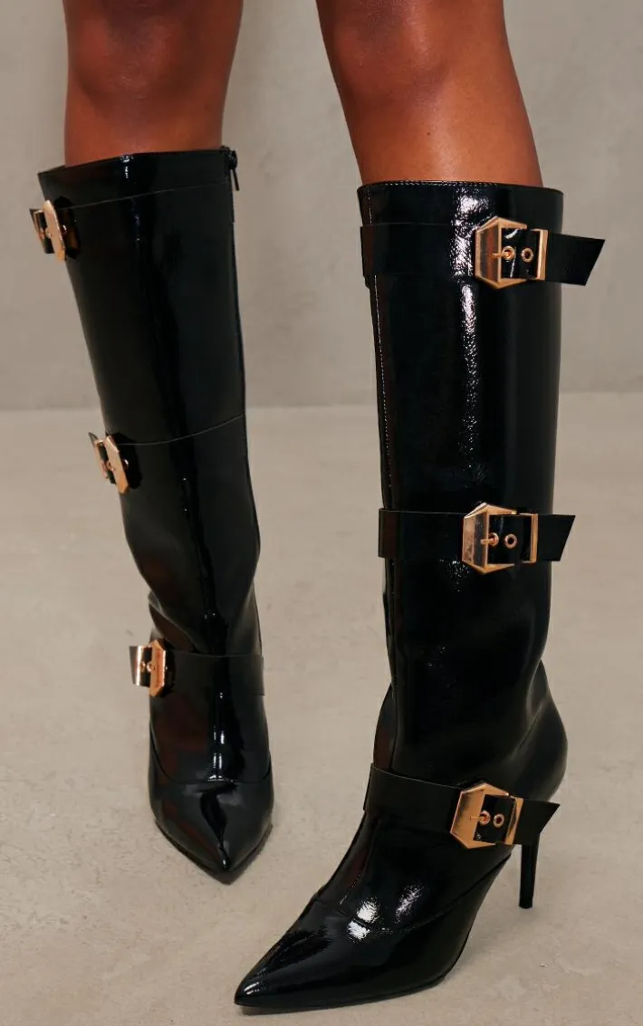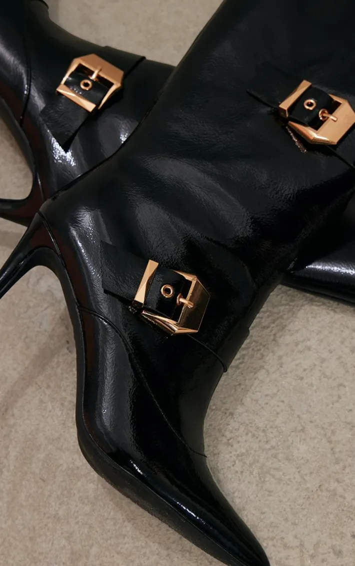 Make a statement this weekend with these black PU patent point toe buckle knee high heeled boots and be sure to earn all the compliments. Made from a black PU patent material with buckle detail and a knee-high design, how could you say no? Whatever your weekend plans might involve, be sure to earn that best dressed status with these heeled boots.
