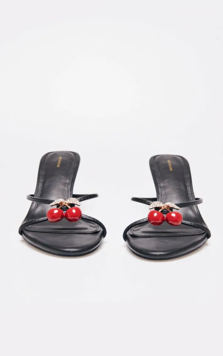 Switch up your everyday heels with these black PU round toe cherry trim heeled mules. Made with a black PU material, a round toe fit and a pop of color with their cherry trim feature, they’re a simple way to elevate your look. Style these heeled mules with your favorite denim jeans for a nostalgic finish.
