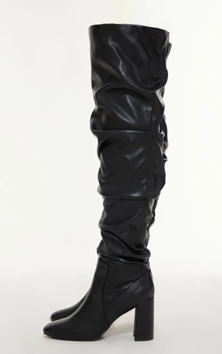 When the dress code calls for glam vibes these black PU round toe ruched over-the-knee block heeled boots tick all the boxes. With a black PU material, ruched detailing and an over-the-knee design, these heeled boots are sure to make everyone stop and stare. Perfect for pairing with a dreamy figure-flattering ‘fit, these boots are everything you’re looking for and more.