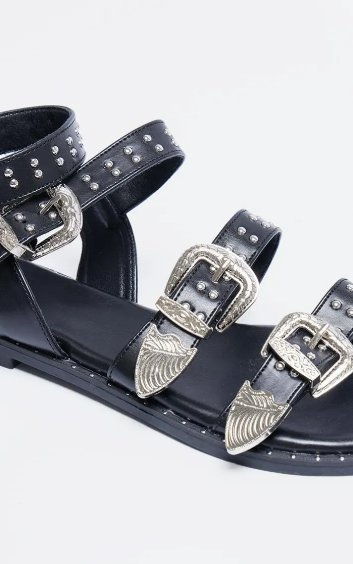 Instantly elevate your outfit of the day with these black PU round toe studded buckle detail gladiator sandals. Brought to you in a black PU material with a round toe design, buckle fastenings and stud detailing for that extra added edge, we are obsessed. Style these gladiator sandals with your fave wardrobe pieces to take your look to new heights.