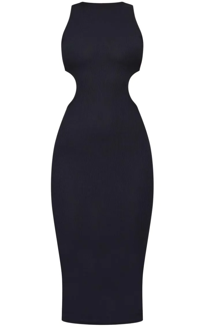 Your weekend outfit is finally sorted with this dress. Featuring a black rib material with a cut-out side detail and a midmaxi length. Team this with a pair of clear heels for a look that will get you noticed.