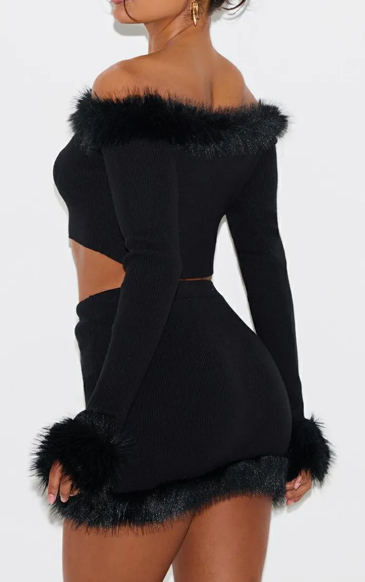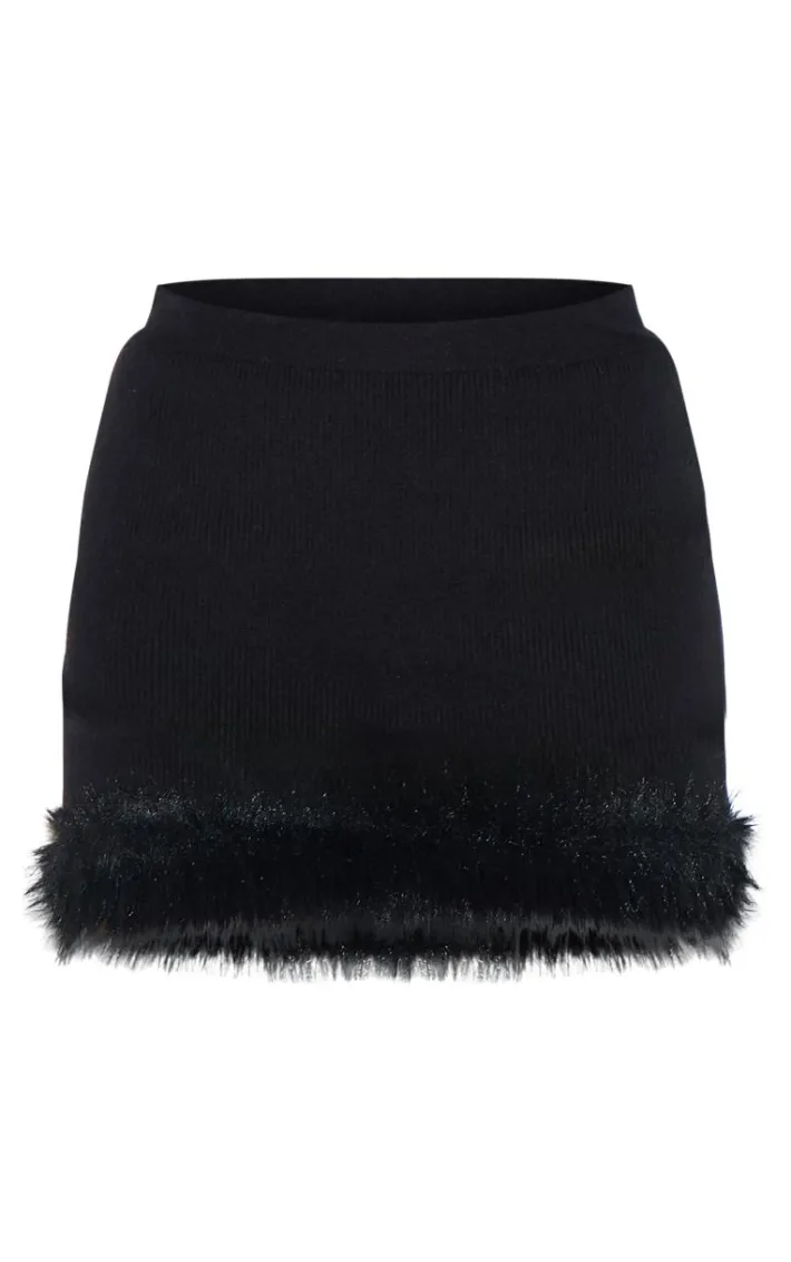 Introducing this black rib knit fur trim mini skirt as your new go to. Made from a black hue rib knit material with a fur trim detail, this mini skirt is a must have. Style with the matching top, slip on heels and simple accessories for a look like no other.