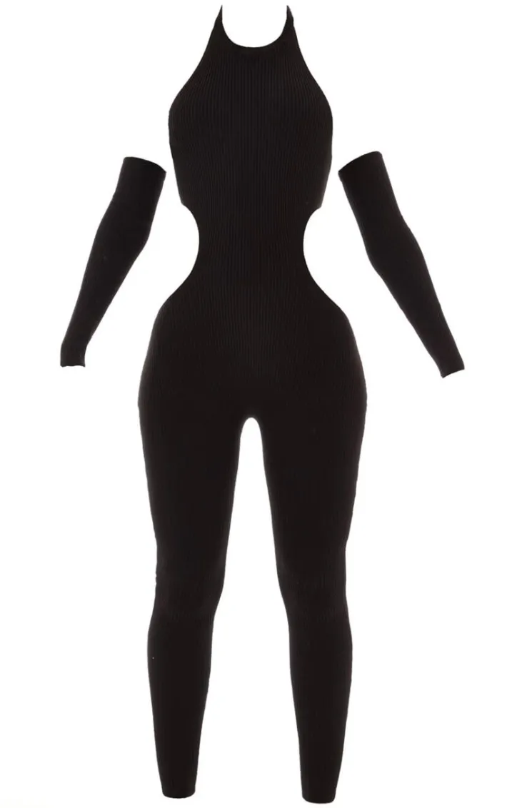 Make heads turn this season in this black rib knit halterneck cut out jumpsuit & sleeves. This jumpsuit features a black hue rib knit material with a cut out design and a figure-flattering fit that will make a statement, what are you waiting for? Add this ultra-chic piece to your weekend collection. Team with some clear heels, a shoulder bag and gold accessories for a finished look that will get you noticed, this will not disappoint.