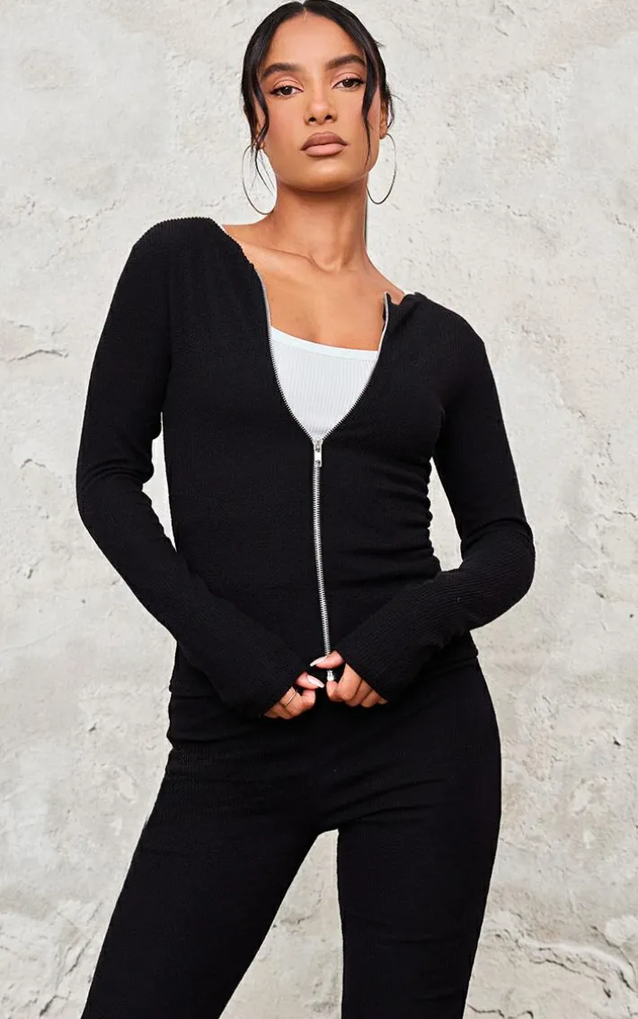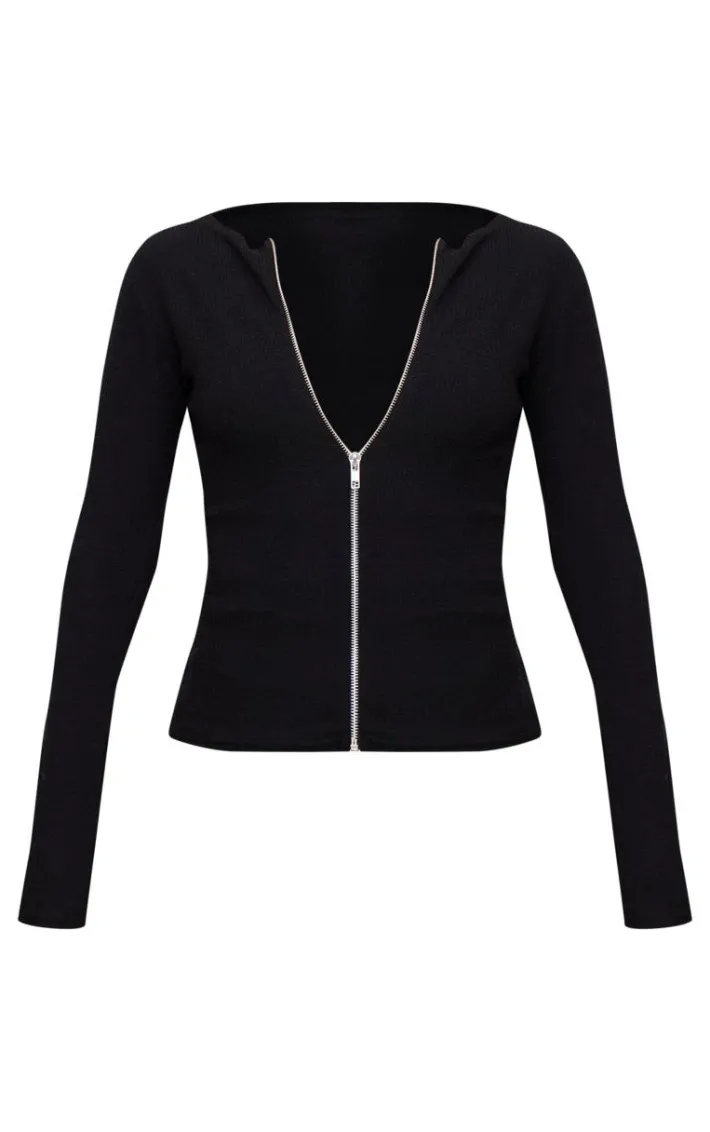 This black rib longline zip up top is a must-have basic for any wardrobe. Made with a soft rib fabric, it’s a staple zip up top that pairs perfectly with any off-duty look. We know you’ll look unreal when paired with flair leg pants and some chunky sole shoes, so what are you waiting for?