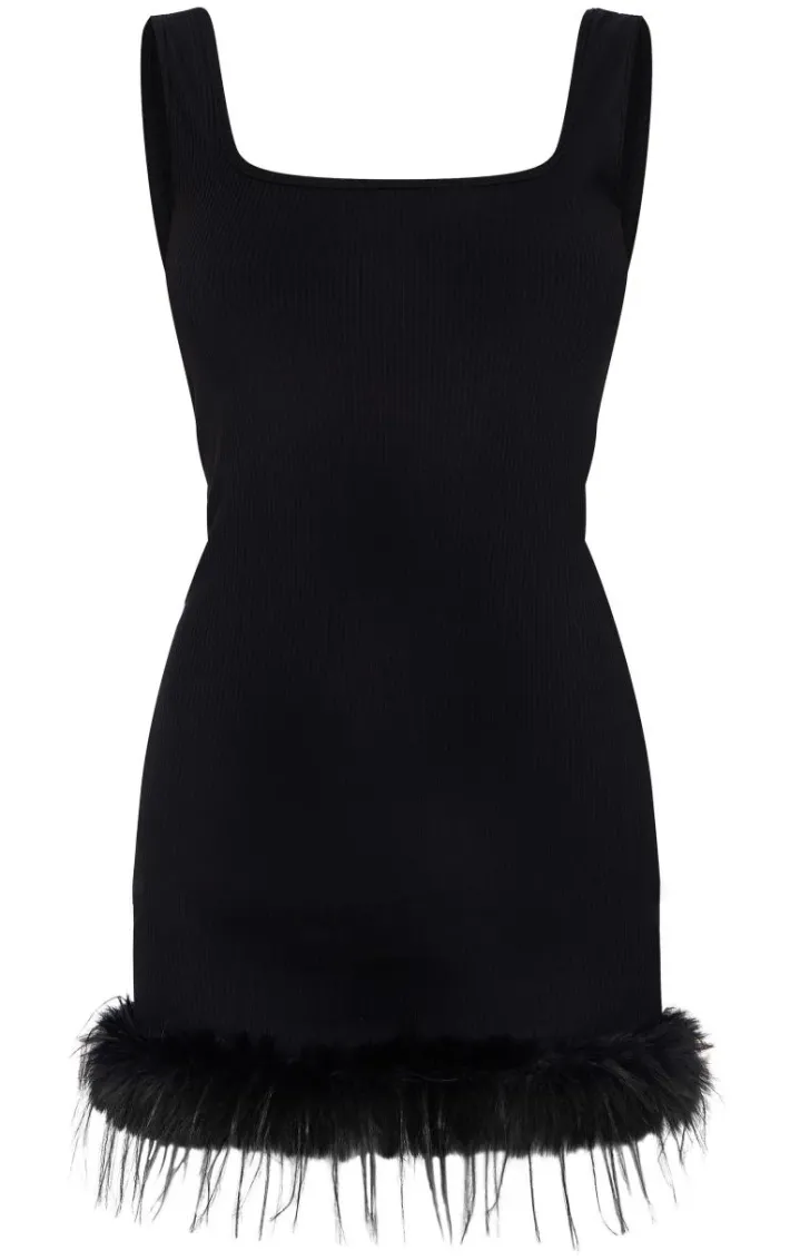 We’re in love with this black ribbed feather hem bodycon dress. Brought to you in a black hue ribbed material with a feather hem design and square neckline, this bodycon dress is a must have. Style with slip on heels and simple accessories for a look like no other.