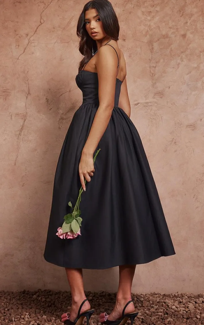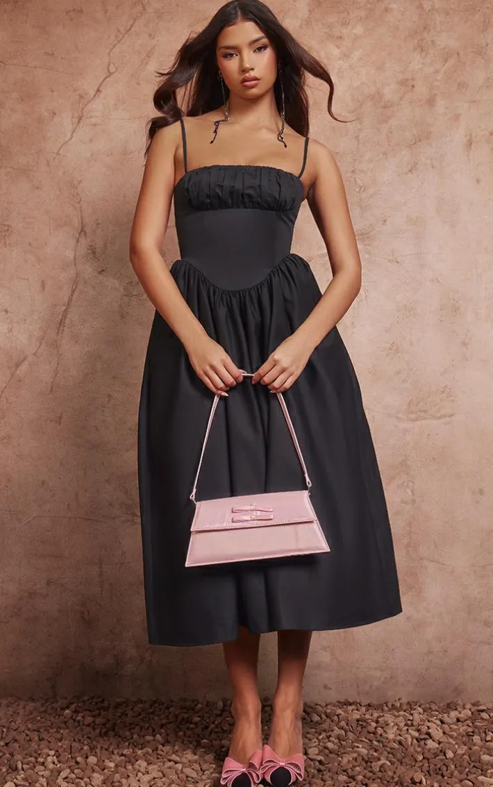 Channel all the glam vibes this weekend with this black ruched bust corset strappy midaxi dress and be sure to earn all the compliments. Made from a black hue material with a ruched bust detail and a corset design, how could you not be obsessed? Bound to nail the dress code, this midaxi dress is calling your name. Style effortlessly with bow detail court heels, statement accessories and a mini bag for a dreamy vibe that won’t go unnoticed.