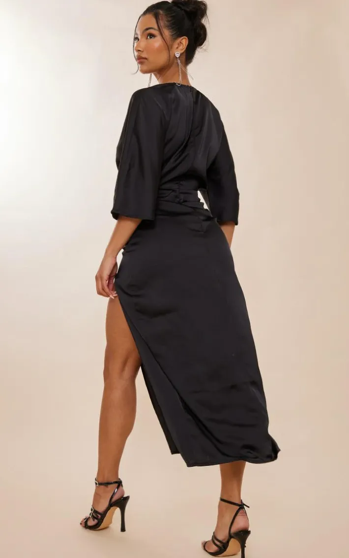 Upgrade your dress collection with this black satin batwing plunge midaxi dress and become the center of attention. Its black satin material adds a glam touch and its plunging neckline shows off your sultry side. This midaxi dress is seriously fresh for this new season with its batwing design and split hem giving you that extra edge. Keep it chic with strappy heels and minimal accessories for a winning look.