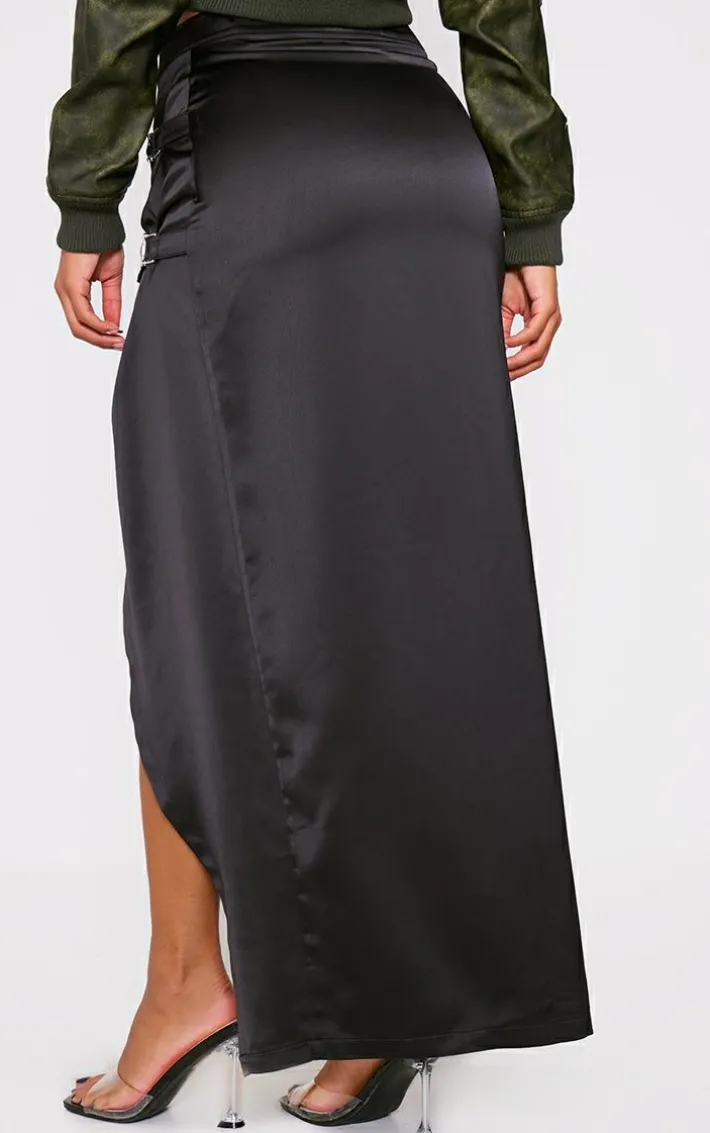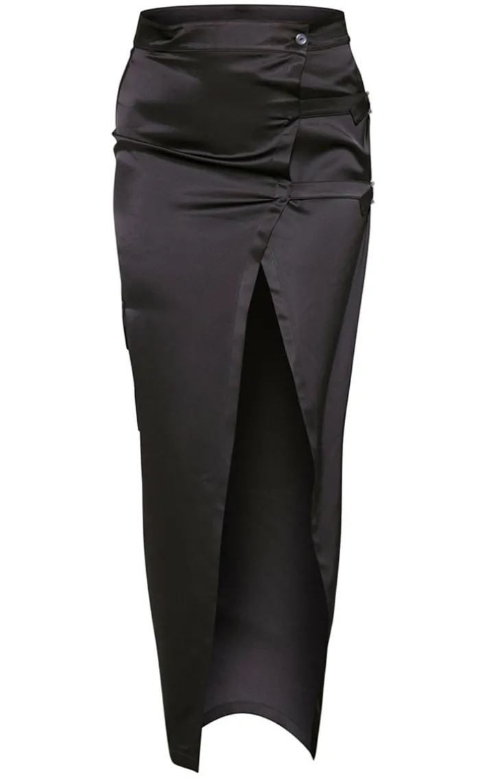 Keep it chic with this black satin buckle side maxi skirt. Brought to you in a black satin material with a buckle side adding a touch of luxe to any look. This unreal skirt has a maxi length that is sure to turn heads no matter what. Team with a crop top and a pair of clear heels to elevate the look even further, it’s a definite yes from us.