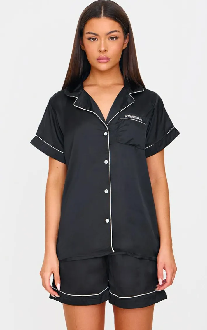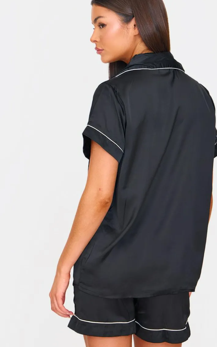 You are sure to be feeling your best self with this black satin contrast piping short PJ set. This set includes a short sleeve shirt and matching shorts, both in a black satin material with a contrast piping detail and a comfyfit, we are obsessed. Wear with minimal accessories and fluffy slippers to finish.
