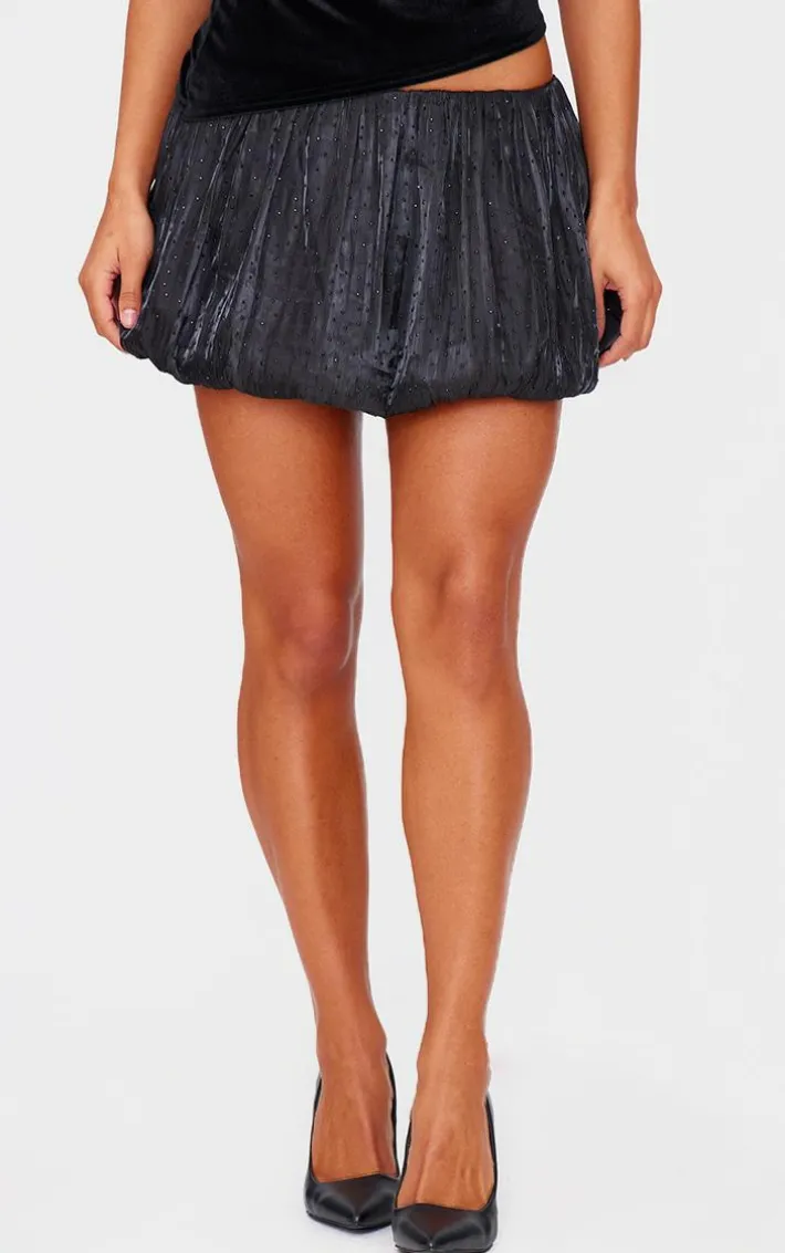 This black satin embellished puffball mini skirt is calling your name for a glam look we’re loving. With a staple black shade, a luxe satin material, embellished detail for an extra vibe, and puffball style, you won’t want to take this one off. Style with a black top, your best heels, silver accessories and a shoulder bag to really pull off the look.