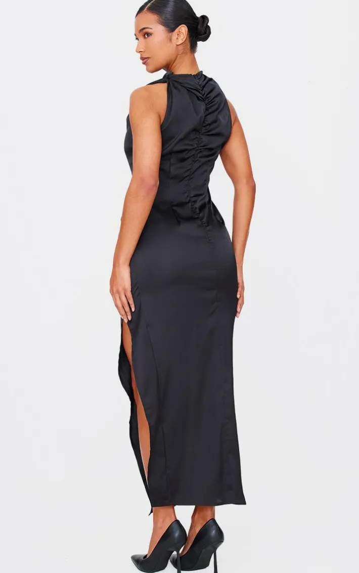 The new you is here with this black satin high neck ruched back detail midi dress. Brought to you in a black satin material with a high neck design and a ruched back detail, you are sure to be showing off you shape in this midi dress. Team with a pair of heels and your go-to accessories to finish off the look that will get you noticed for all the right reasons.