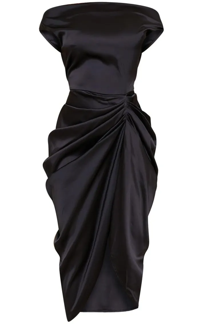 Hit refresh on your occasion wear wardrobe with this satin dress , perfect for all those special evening plans. Featuring a black satin material with a draped skirt detail, an off-the-shoulder design and a midi length, we are obsessed. An off the shoulder dress is never a miss , simple, stylish and chic, this satin material is giving us all the luxe vibes. Team this mini dress with heels and simple accessories for a look we can’t get enough of.