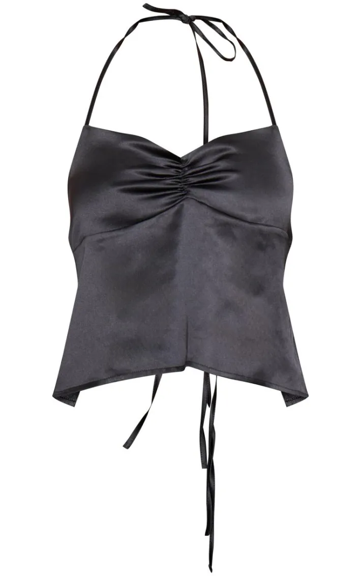 Add a touch of luxe to your new season wardrobe with this black satin ruched halterneck tie back cami top, we’re in love. This top features a black satin material with ruched detailing and a tie back design, how could you say no? Style this satin top with the matching pants, heels and your fave accessories for a look you’ll be reaching for again and again.